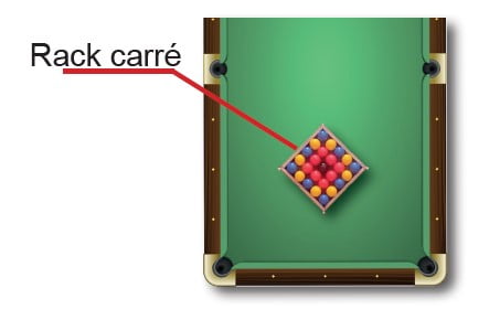 Le rack du Snooky Ball est un rack carré* placé en losange par rapport au rectangle de la table. On doit placer le rack de boules au centre de la table sur les points pré-déterminés en plaçant les bleus et les jaunes en alternance autour et les rouges à l’intérieur, puis la noir au centre.
