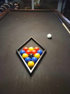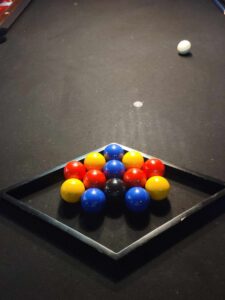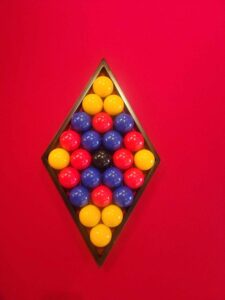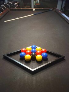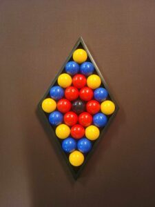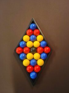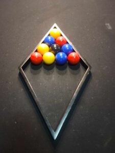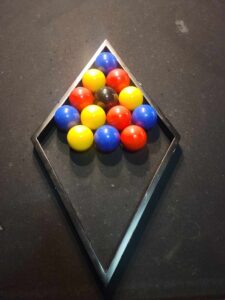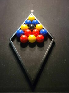 Le rack du Snooky Ball est un rack Losange* placé en losange par rapport au carré de la table. On doit placer le rack de boules au centre de la table sur les points pré-déterminés en plaçant les bleus et les jaunes en alternance autour et les rouges à l’intérieur, puis la noir au centre.