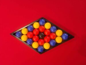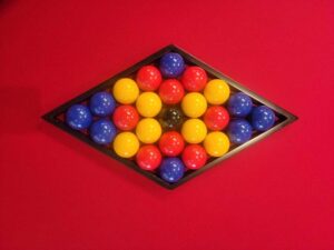 Il est aussi possible d’adapter ce règlement à trois joueurs. Ici chaque joueur a une couleur de boule soit; jaune, bleue et rouge. Les boules rouges ne comptent alors que pour 1 points et ainsi, aucune boule ne compte pour 2 points. La boule noire demeure à 3 points.